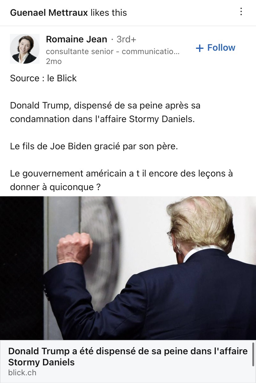 “Donald Trump, i përjashtuar nga dënimi i tij pas dënimit në çështjen Stormy Daniels. Djali i Joe Biden falet nga babai i tij. A ka qeveria amerikane ende mësime për t’i mësuar dikujt?”, thuhet në shkrimin e Romaine Jean, të cilin e ka pëlqyer publikisht gjyqtari Guenael Mettraux./Demokracia.com/