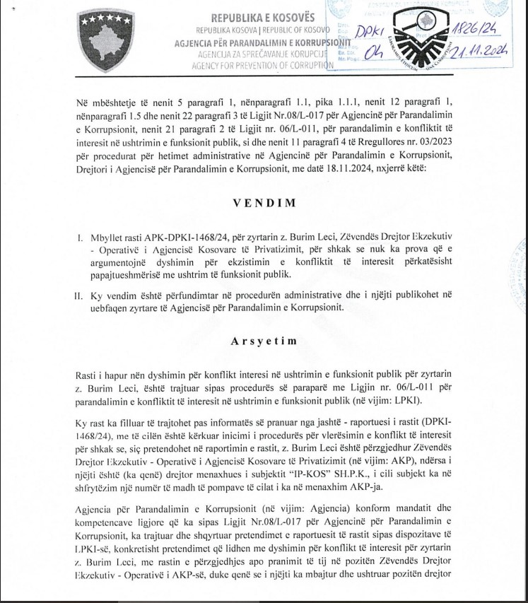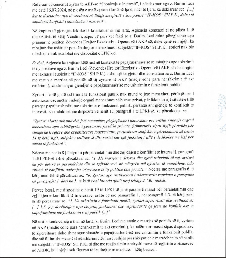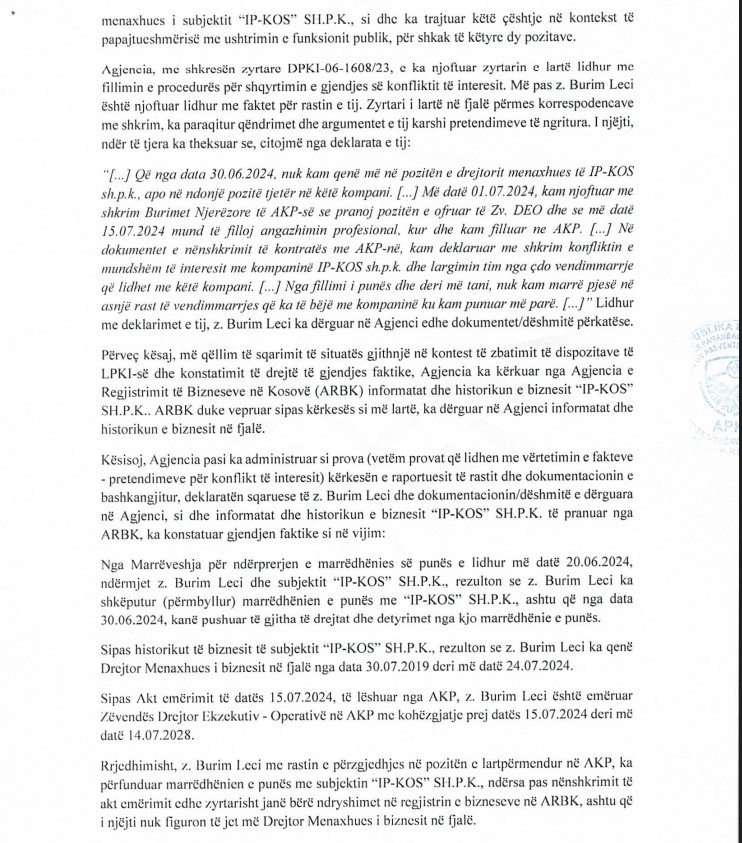 Megjithatë, nga të dhënat e siguruara nga Agjencia e Regjistrimit të Bizneseve në Kosovë (ARBK), del se Leci figuron si drejtor menaxhues i “IP-KOS” deri më 24 korrik 2024, pra pas datës kur ai ka filluar punën në AKP. Pavarësisht kësaj, Agjencia për Parandalimin e Korrupsionit ka konstatuar se nuk ka shkelje ligjore dhe ka mbyllur rastin pa ndonjë masë.