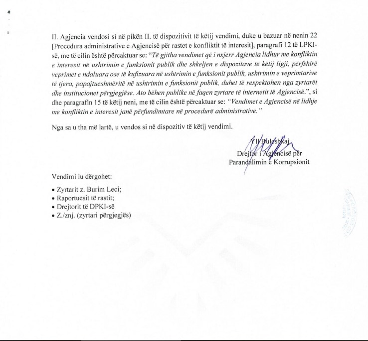 Së fundmi, ajo ka mbyllur rastin e Burim Lecit, Zëvendës Drejtorit Ekzekutiv Operativ të Agjencisë Kosovare të Privatizimit (AKP), me arsyetimin se nuk ka prova që vërtetojnë ekzistencën e një konflikti interesi apo papajtueshmërie me ushtrimin e funksionit publik.