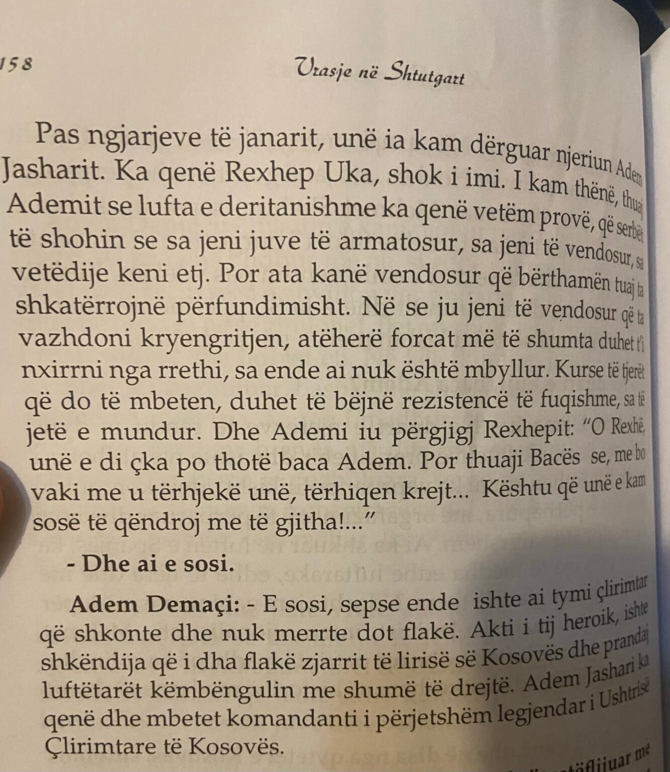 Në librin “Vrasje në Shtutgart”, nga autori Apostol Duka ishte intervistuar edhe simboli i rezistencës kombëtare, tashmë i ndjeri Adem Demaçi. Libri i kushtohej veprimtarisë së heroit Kadri Zeka, por Adem Demaçi kishte treguar edhe për mesazhin dhe komunikimin nga larg që kishte pasur me komandantin legjendar Adem Jashari, para fillimit të luftimeve në Prekaz.