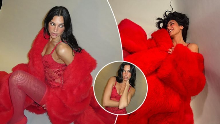 Me flokët e gjatë dhe të zinj të stiluar në onde të lira, Dua u fotografua e ulur përdhe, para se ta hiqte pallton, duke vënë në pah linjat e saj perfekte.