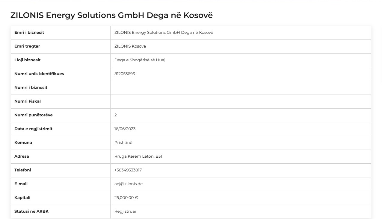 Kompania ZILONIS Energy Solutions GmbH – Dega në Kosovë, është regjistruar në qershor të vitit 2023 në Agjencinë për Regjistrimin e Bizneseve në Kosovë (ARBK). Po atë vit, ajo u prezantua nga autoritete të fushës së biznesit si një kompani me potencial për investime në vend.