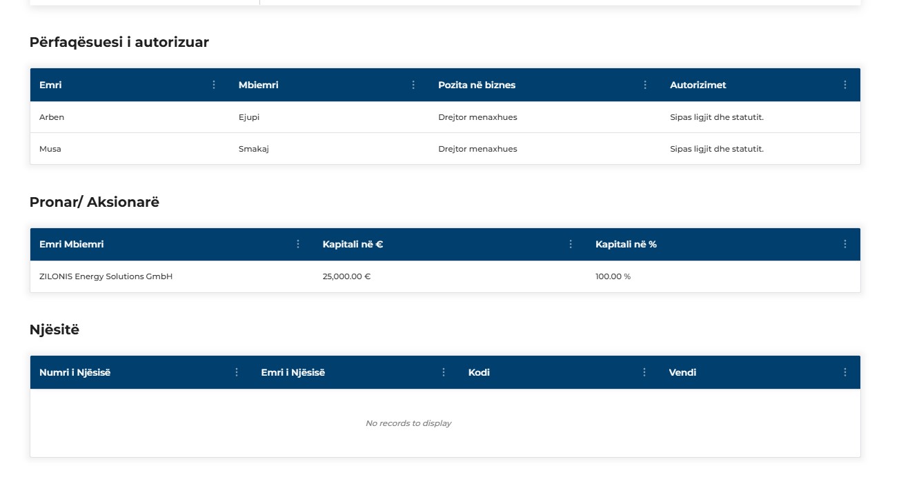 Personat e autorizuar të kësaj kompanie në Kosovë janë Arben Bujupi dhe Musa Smakaj, ndërsa si pronar është e regjistruar kompania mëmë ZILONIS Energy Solutions GmbH.