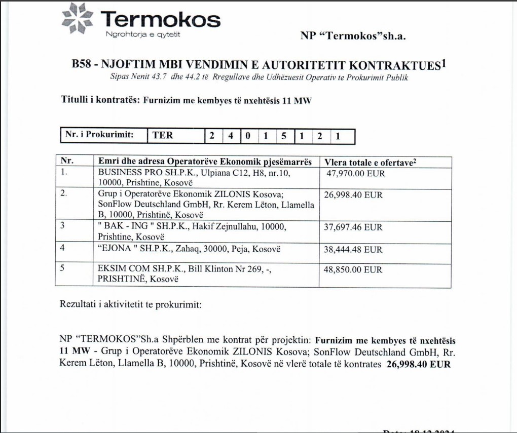 Më 18.12.2024, Termokosi ka publikuar Njoftimin mbi Vendimin B58, përmes të cilit ka shpërblyer me kontratë operatorin ekonomik “ZILONIS Kosova: SonFlow Deutschland GmbH” nga Prishtina.