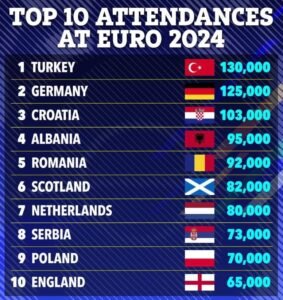 Mediat gjermane kanë publikuar një listë të shteteve me më së shumti tifozë të pranishëm në Kampionatin Evropian i cili po mbahet në Gjermani.