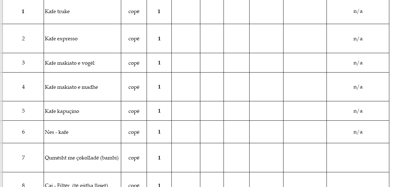 “Kafe truke. Kafe expresso. Kafe makiato e vogël. Kafe makiato e madhe. Kafe kapuçino. Nes – kafe
