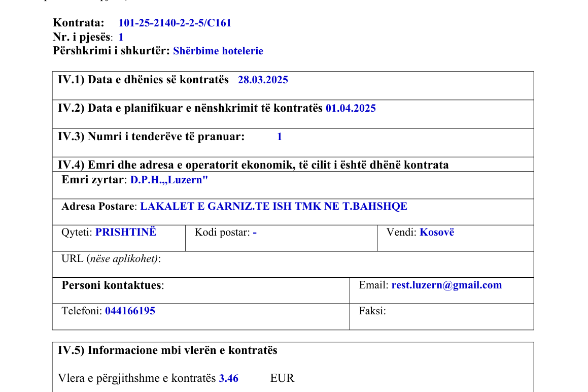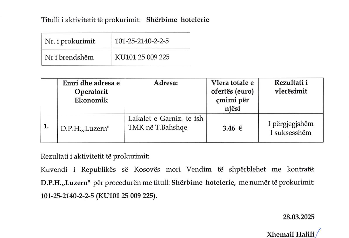 “Shërbime Hotelerie. Vlera e parashikuar e kontratës: 36,000.00 euro. Kuvendi i Republikës së Kosovës, kohëzgjatja e marrëveshjes kornizë: në muaj 6. Data e dhënies së kontratës 28.03.2025. Data e planifikuar e nënshkrimit të kontratës 01.04.2025. Emri dhe adresa e operatorit ekonomik, të cilit i është dhënë kontrata D.P.H.”Luzern”. Qyteti: Prishtinë. Vlera e përgjithshme e kontratës 3.46 euro”, thuhet në njoftimin e shpallur.