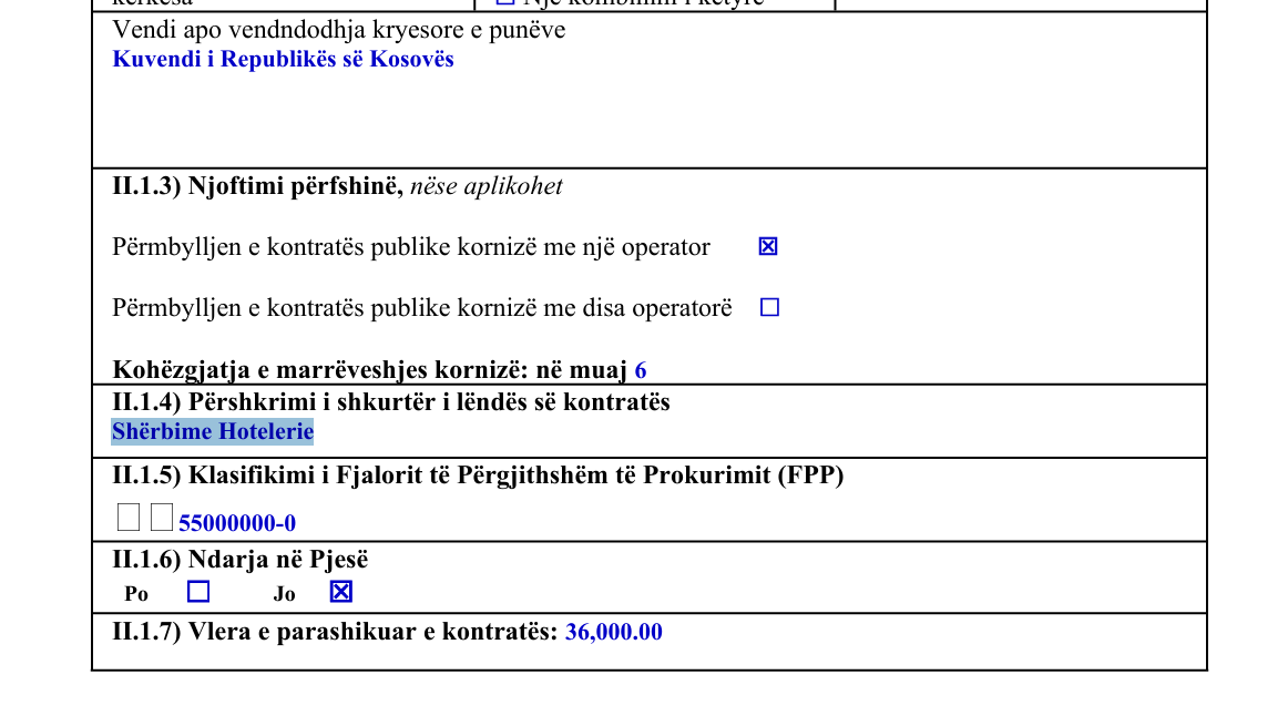“Shërbime Hotelerie. Vlera e parashikuar e kontratës: 36,000.00 euro. Kuvendi i Republikës së Kosovës, kohëzgjatja e marrëveshjes kornizë: në muaj 6. Data e dhënies së kontratës 28.03.2025. Data e planifikuar e nënshkrimit të kontratës 01.04.2025. Emri dhe adresa e operatorit ekonomik, të cilit i është dhënë kontrata D.P.H.”Luzern”. Qyteti: Prishtinë. Vlera e përgjithshme e kontratës 3.46 euro”, thuhet në njoftimin e shpallur.