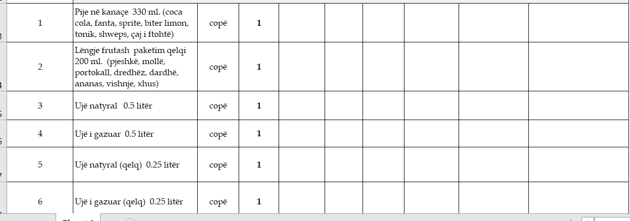 “Pije në kanaçe 330 ml. (coca cola, fanta, sprite, biter limon, tonik, shëeps, çaj i ftohtë). Lëngje frutash paketim qelqi 200 ml. (pjeshkë, mollë, portokall, dredhëz, dardhë, ananas, vishnje, xhus). Ujë natyral 0.5 litër. Ujë i gazuar 0.5 liter. Ujë natyral (qelq) 0.25 litërl Ujë i gazuar (qelq) 0.25 litër”.
