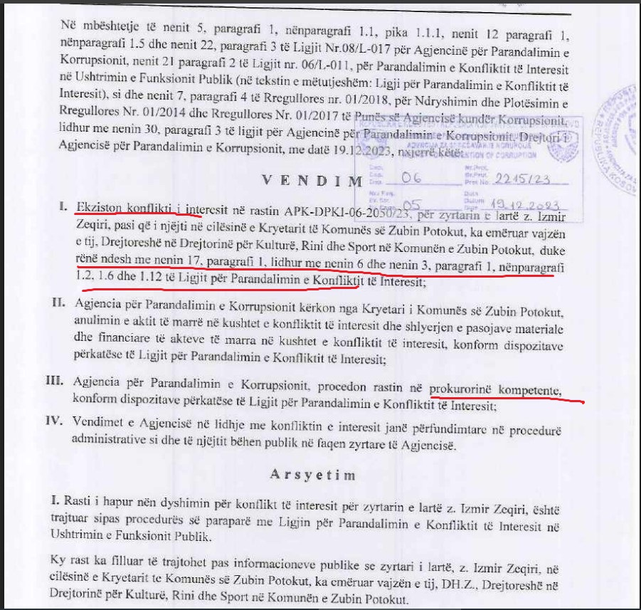 Në vitin 2023, API ka konfirmuar konfliktin e interesit të z. Izmir Zeqiri, Kryetar i Komunës së Zubin Potokut, për shkak të emërimit të vajzës së tij si Drejtoreshë në Drejtorinë për Kulturë, Rini dhe Sport. Në këtë rast, Agjencia ka referuar të njëjtat nene ligjore si në rastin e Ramës, por ka kaluar menjëherë në procedurat përkatëse në Prokurorinë kompetente, duke trajtuar çështjen si një vepër penale dhe jo thjesht kundërvajtje administrative.