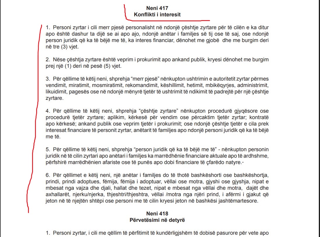 Kodi Penal i Kosovës, konkretisht neni 417, parashikon masa të qarta për parandalimin e konfliktit të interesit dhe përcakton se çdo person zyrtar që merr pjesë në vendime ku ka interes personal, familjar apo biznesor, duhet të ndihet përgjegjës dhe i ndëshkueshëm në bazë të ligjit penal.