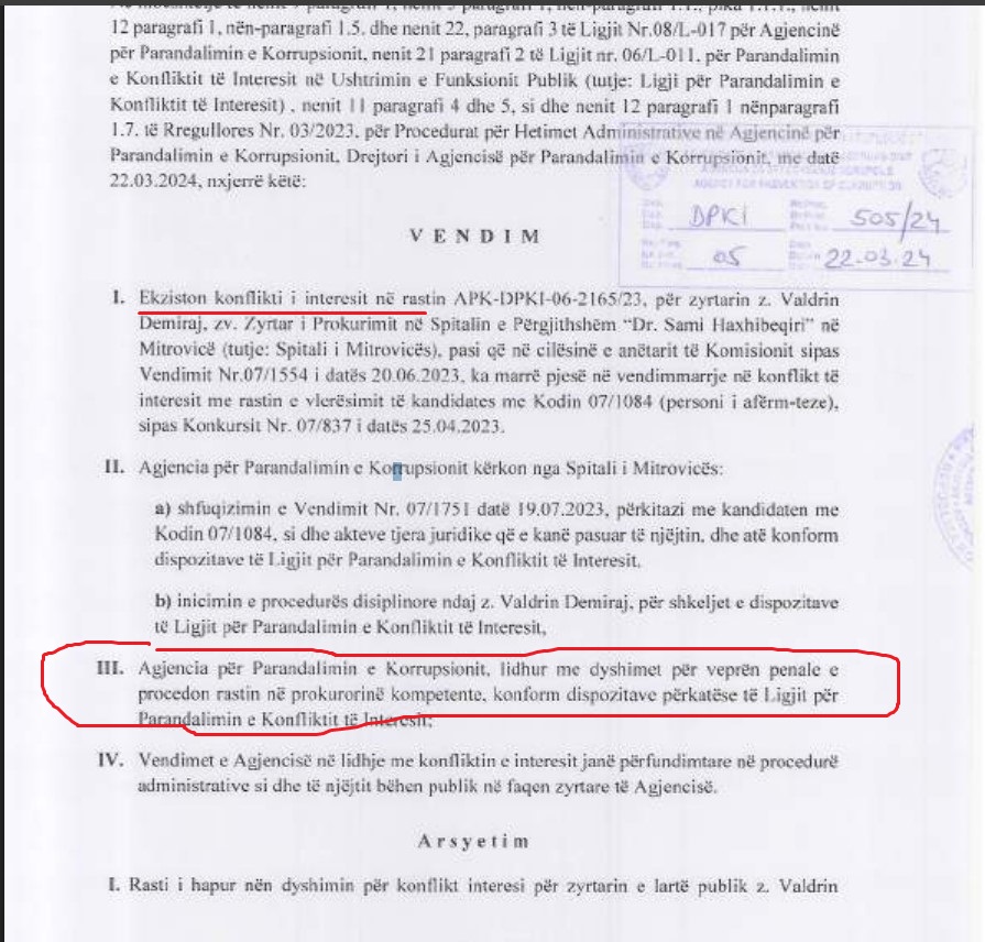Në mënyrë të ngjashme, për rastin e z. Valdrin Demiraj, zv. Zyrtar i Prokurimit në Spitalin e Përgjithshëm “Dr. Sami Haxhibeqiri” në Mitrovicë, Agjencia ka gjetur konflikt interesi në përfshirjen e tij në vendimmarrje për vlerësimin e një kandidati të afërt familjar, duke e proceduar rastin në prokurori si dyshim për vepër penale.