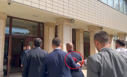 Ndërkohë, njëri nga truprojat e tij është parë duke ia shtyrë mikrofonin një gazetari.