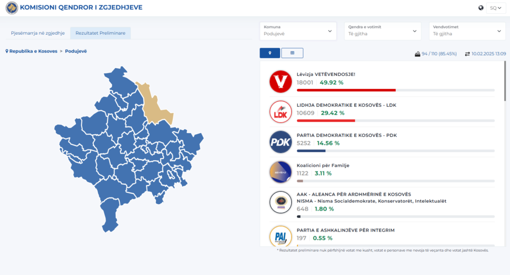 Lëvizja Vetëvendosje ka dalë partia më e votuar në Podujevë. Kur janë procesuar 85.45% të vendvotimeve atje, del se ka marrë 18,001 vota apo 49.92%.