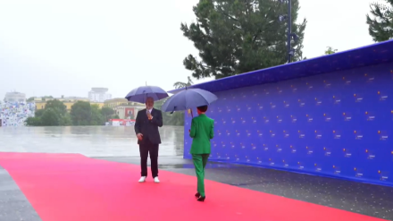 Me një çadër në dorë, Rama qëndroi në tapetin e kuq, ndërsa në sfond dëgjohej kënga “Zjerm” nga Shkodra Elektronike, përfaqësuesja e Shqipërisë në Eurovisionin e këtij viti.