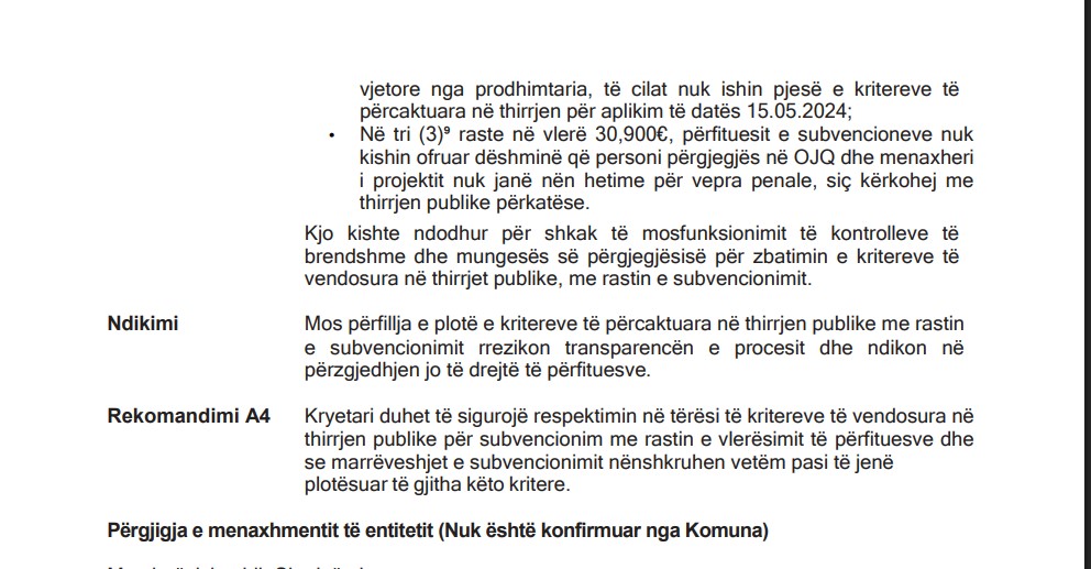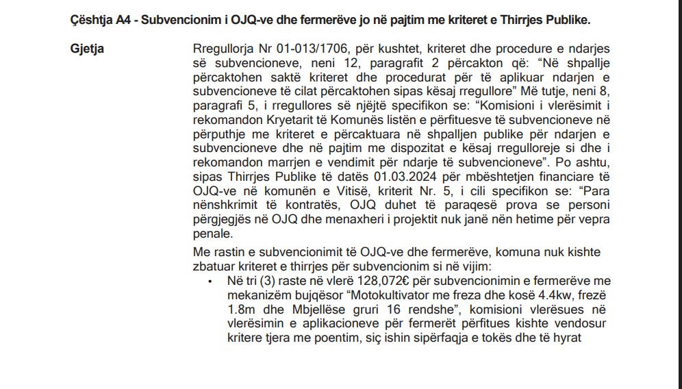 Gjetjet e auditorit janë shqetësuese. Në tri raste në vlerë prej 128 mijë euro, për subvencionimin e fermerëve me pajisje bujqësore, komisioni vlerësues kishte vendosur kritere të reja që nuk ekzistonin në thirrjen publike,  si sipërfaqja e tokës apo të hyrat nga prodhimtaria bujqësore. Me fjalë të tjera, kriteret janë shpikur në tavolinë pasi thirrja ishte shpallur, në kundërshtim me Rregulloren komunale Nr. 01-013/1706 dhe vet shpalljen publike të datës 15 maj 2024.