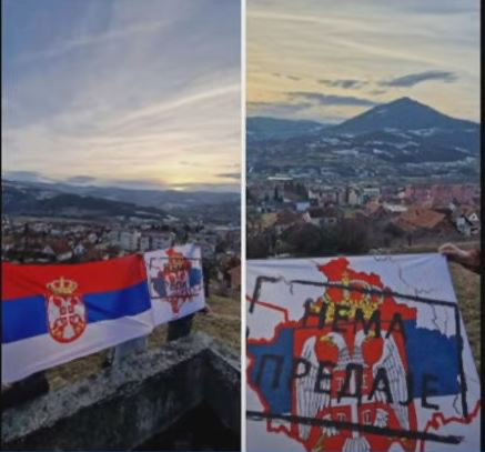 Një flamur i përbashkët i Serbisë dhe Kosovës u zhyt në hartën me tre ngjyrat serbe, ku ishte shkruar “Nuk ka dorëzim”, duke shfaqur në sfond pamje të veriut të Mitrovicës.