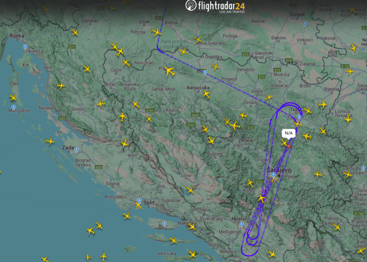 Aeroplani është duke bërë xhiro në shtrirjen midis Mostarit dhe Tuzllës, në shtrirjen midis kufirit të Bosnjë-Hercegovinës dhe Serbisë.