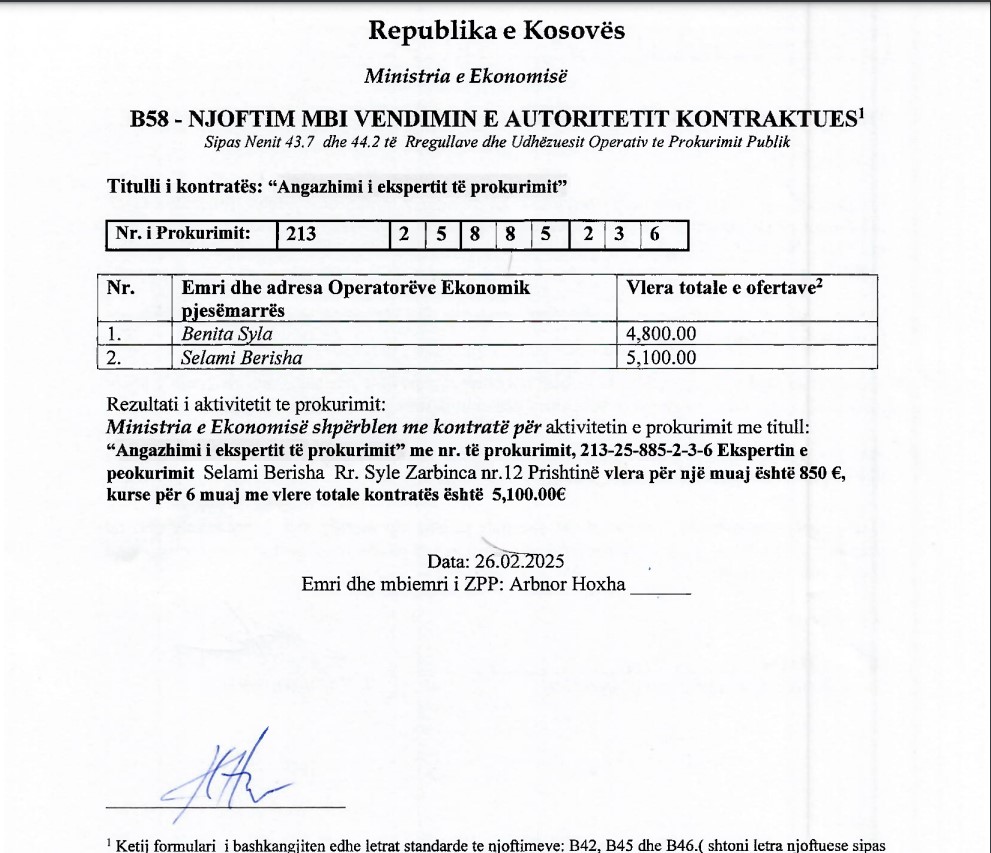 Por, duket se zoti Berisha nuk e kishte ndërmend t’i qëndronte larg institucionit. Vetëm pak ditë pas daljes në pension, Ministria e Ekonomisë organizoi një tender për angazhimin e një eksperti të prokurimit, ku fitues doli pikërisht ish-zyrtari që sapo ishte larguar.