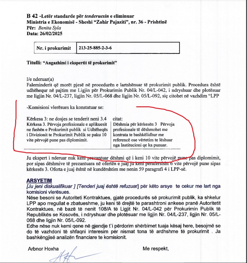 “Përvojë profesionale në fushën e prokurimit publik si Udhëheqës i Divizionit të Prokurimit Publik për së paku 10 vite pas diplomimit”.