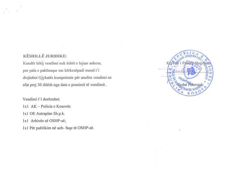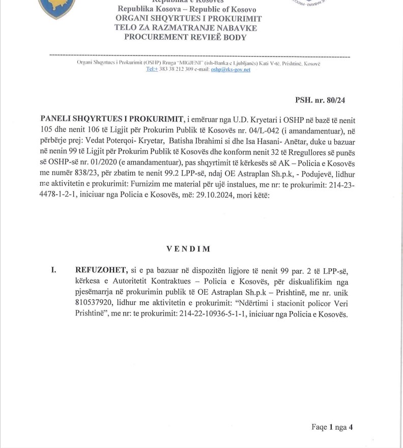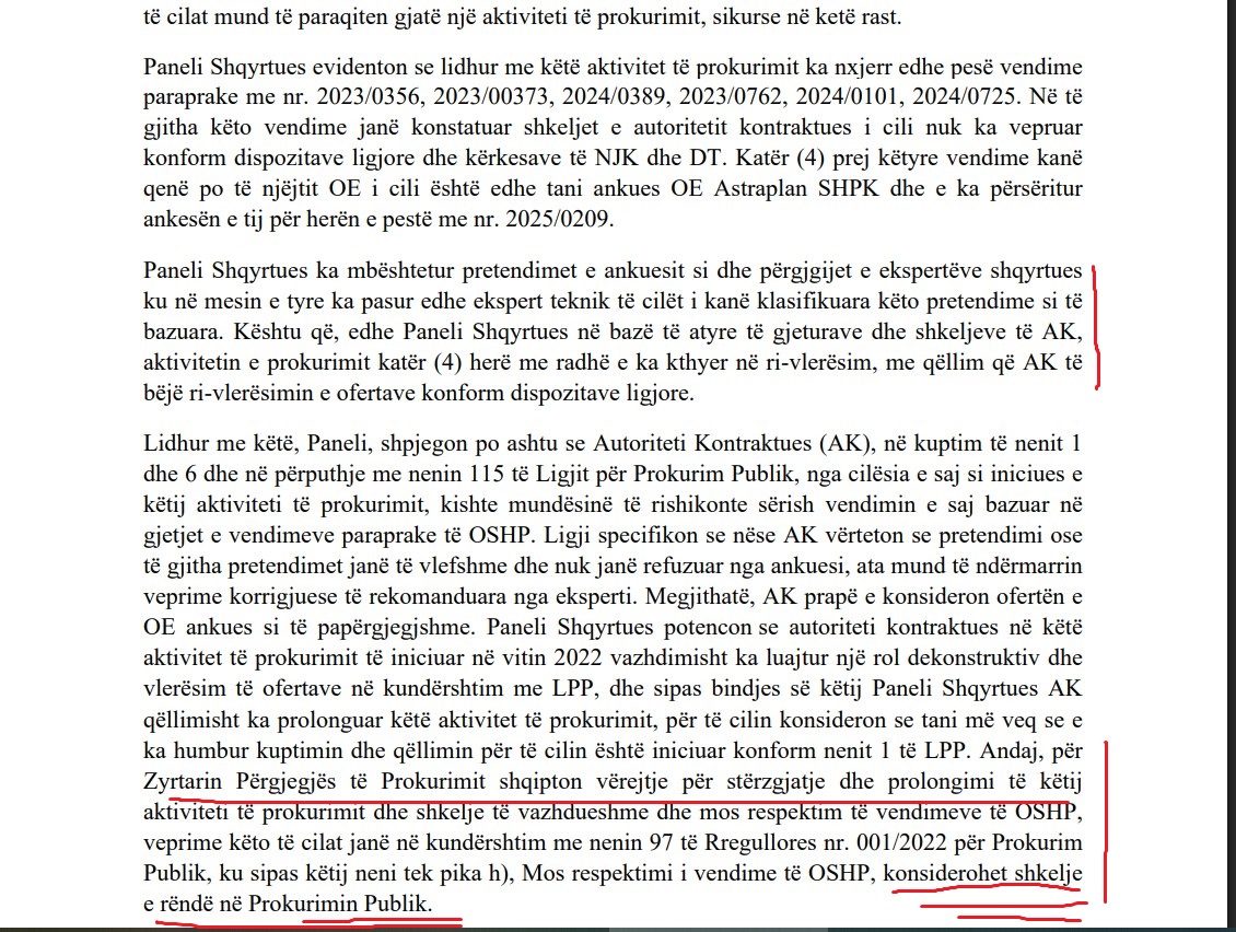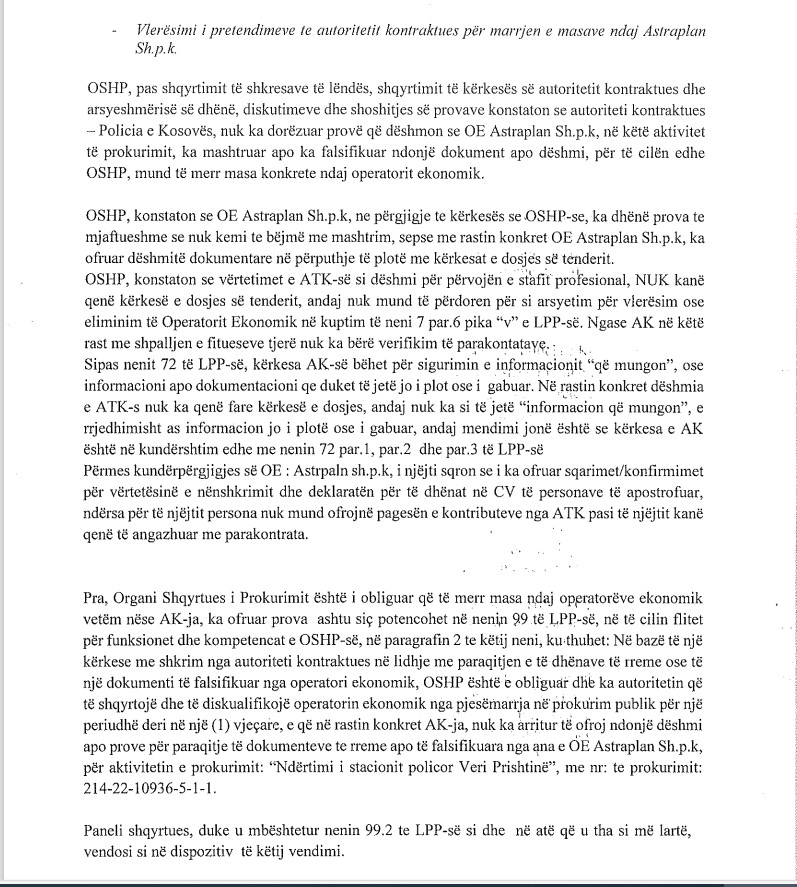 Paneli shqyrtues, i kryesuar nga Vedat Poterqoi, vlerësoi se kërkesa për përjashtimin e Astraplanit ishte e pabazuar, ndërsa shtoi se përjashtimet në tenderë për shkak të falsifikimeve kërkojnë prova të pakontestueshme. Megjithëse Kodi Penal i Kosovës e cilëson falsifikimin si vepër të rëndë penale, në këtë rast mungesa e provave e bëri të pamundur zbatimin e masave ndëshkimore, shkruan Demokracia.com.