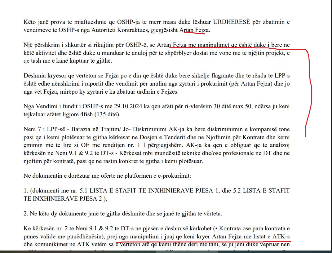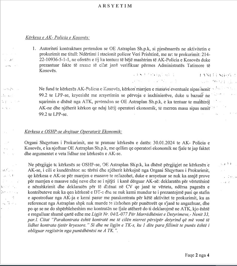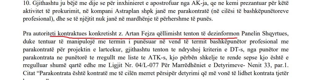 Në ankesën e fundit para vendimit të Panelit, të dorëzuar nga kompania Astraplan SHPK, janë bërë akuza direkte dhe të rënda për korrupsion kundër shefit të prokurimit në Policinë e Kosovës, Artan Fejza.