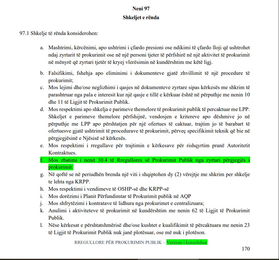 h) Mosrespektimi i vendimeve të OSHP-së dhe KRPP-së konsiderohet shkelje e rëndë në Prokurimin Publik.