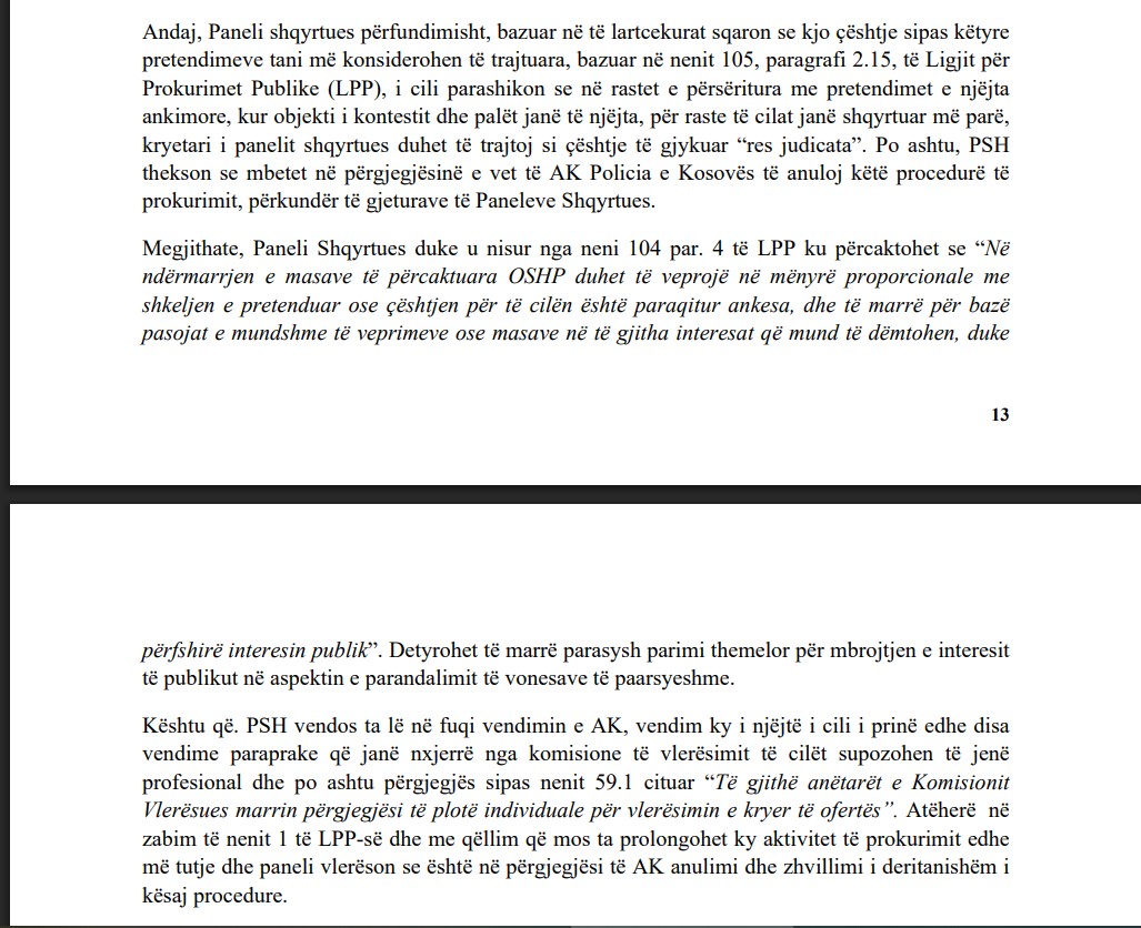 Në vendim thuhet: “. Andaj, për Zyrtarin Përgjegjës të Prokurimit shqipton vërejtje për stërzgjatje dhe prolongimi të këtij aktiviteti të prokurimit dhe shkelje të vazhdueshme dhe mos respektim të vendimeve të OSHP, veprime këto të cilat janë në kundërshtim me nenin 97 të Rregullores nr. 001/2022 për Prokurim Publik, ku sipas këtij neni tek pika h), Mos respektimi i vendime të OSHP, konsiderohet shkelje e rëndë në Prokurimin Publik”.