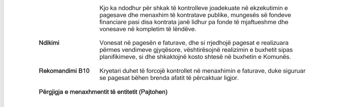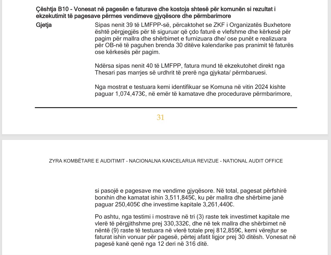 Auditorët kanë gjetur se komuna, në vend të paguajë me kohë për mallrat dhe shërbimet që ka marrë, ka prodhuar vetë dëmin financiar. Sipas testimeve te ZKA, në vitin 2024, janë paguar 3.5 milionë euro përmes vendimeve gjyqësore, prej të cilave rreth 1 milion janë humbje të pastra në emër të kamatave dhe shpenzimeve të përmbaruesve.