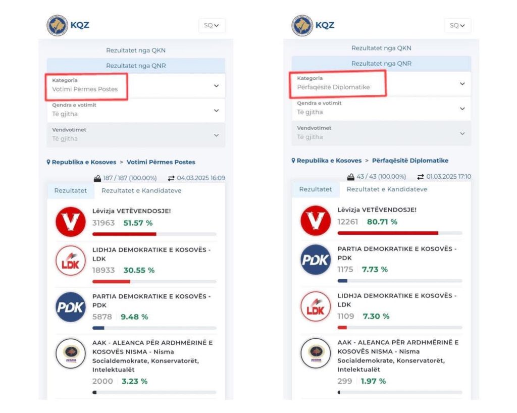 Çuditërisht, Kurti ka kërkuar Rivotim vetëm në votimin me postë, aty ku Lidhja Demokratike e Kosovës ka shënuar rezultat të jashtëzakonshëm, por nuk ka kërkuar Rivotim edhe për votimin në Përfaqësitë Diplomatike aty ku Vetëvendosje ka pushtetin dhe kishte fituar me rezultat të dyshimtë, 80,71%. / Demokracia.com /