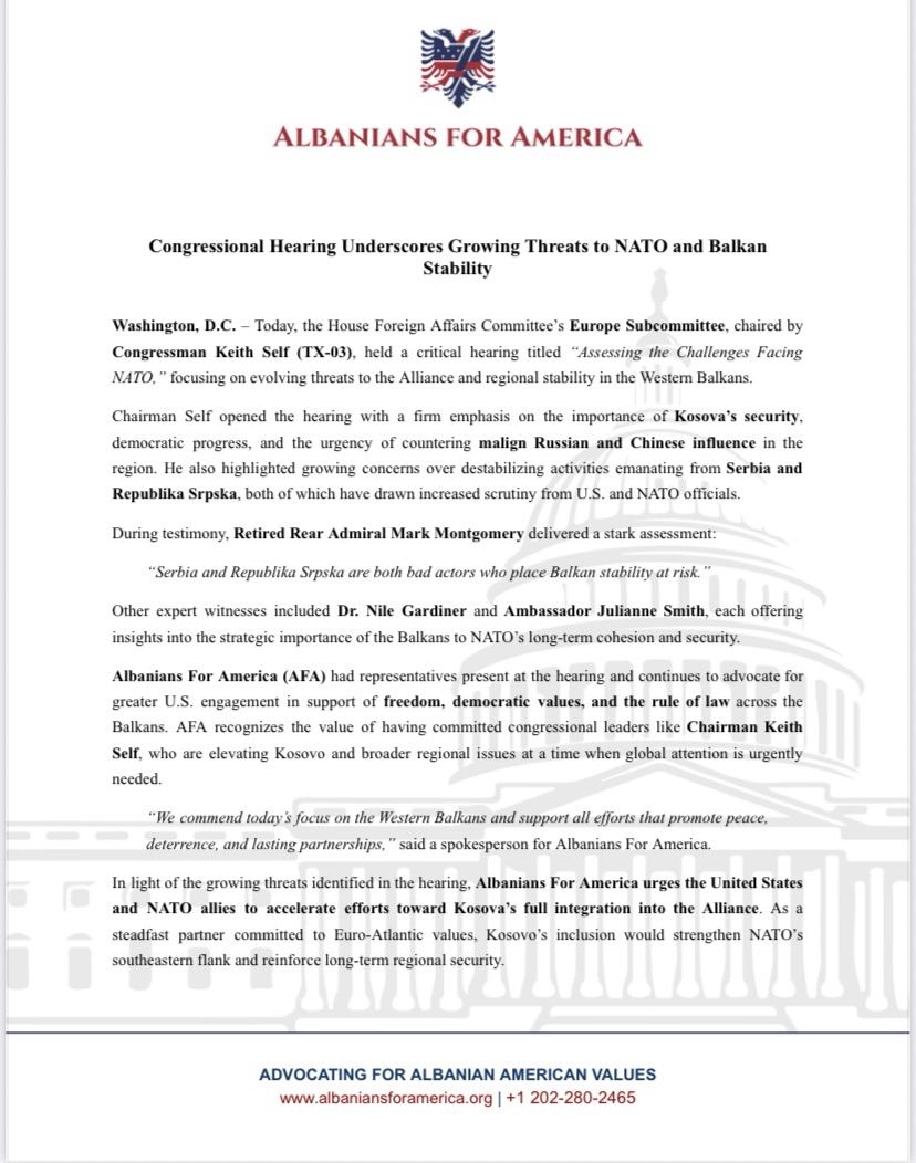 Në dritën e kërcënimeve në rritje të identifikuara në seancë, Shqiptarët Për Amerikën i bën thirrje Shteteve të Bashkuara dhe aleatët e NATO-s për të përshpejtuar përpjekjet drejt integrimit të plotë të Kosovës në Aleancë. Si një partner i palëkundur i përkushtuar ndaj vlerave euroatlantike, përfshirja e Kosovës do të forconte NATO-n krahun juglindor dhe përforcojnë sigurinë afatgjatë rajonale. /Demokracia.com/