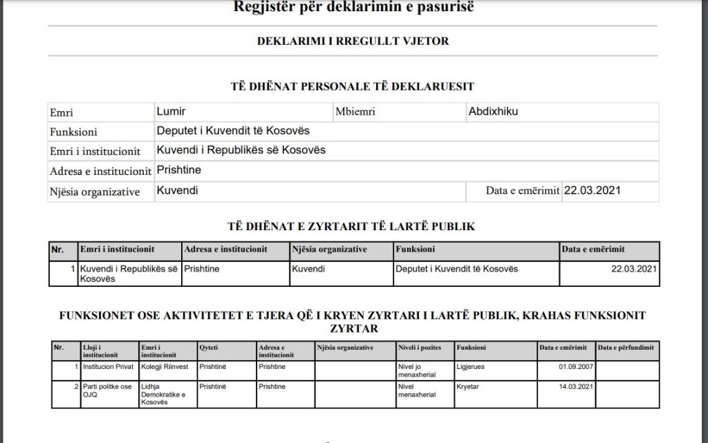 Për më tepër, në deklarimet e fundit të kryetarit të LDK-së, Lumir Abdixhiku, ai ka treguar se ka blerë një banesë në Marigona Hill me një kredi prej 126,020.40 euro, të marrë vitin e kaluar. Ndërsa, ka bërë të ditur se punon si profesor nëRiinvest dhe ka të hyra vjetore 24,000.00 euro. /Demokracia.com/