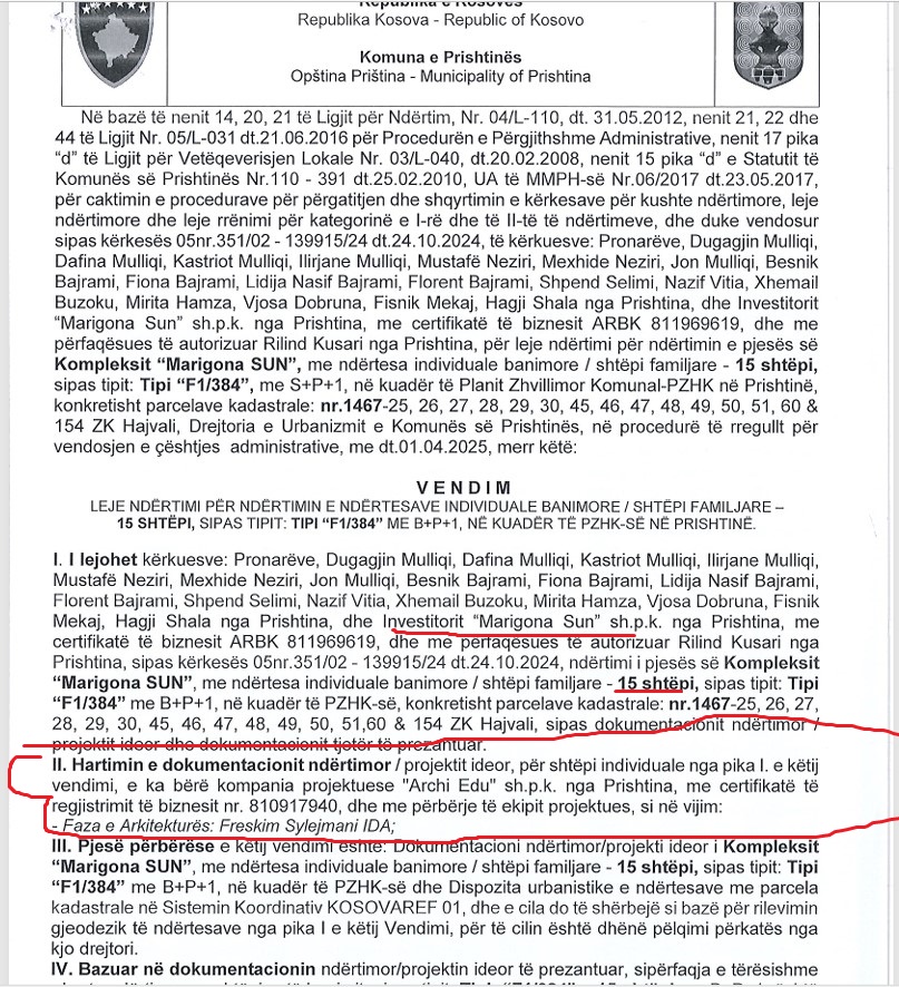 Leja ndërtimore e lëshuar nga Komuna e Prishtinës, konkretisht Drejtoria për Urbanizëm, përfshin ndërtimin e 15 shtëpive të tipit “F1/384” me strukturë B+P+1 (bodrum, përdhesë dhe një kat). Kjo leje është lëshuar në kuadër të parcelave kadastrale në Hajvali, dhe si investitor figuron kompania “Marigona Sun” sh.p.k., me numër biznesi ARBK 811969619 dhe me përfaqësues të autorizuar Rilind Kusari dhe pranrw, Valton Bilalli e Rasim Mrlaku.
