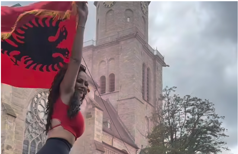 Në Dortmund para tifozëve Kuq e Zi, Xhuli ka vallëzuar e hipur mbi veturë dhe në dorë flamurin kombëtar.